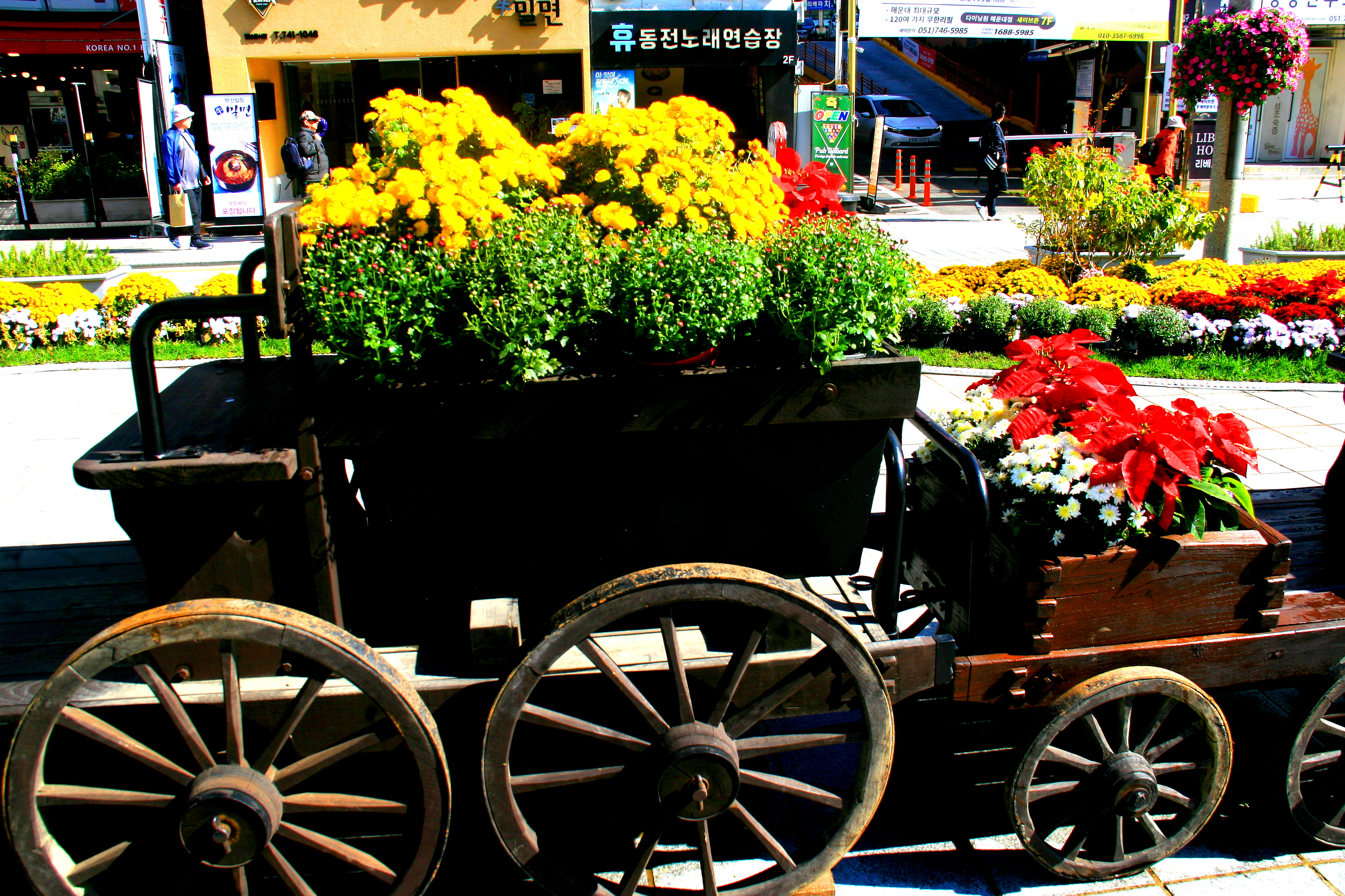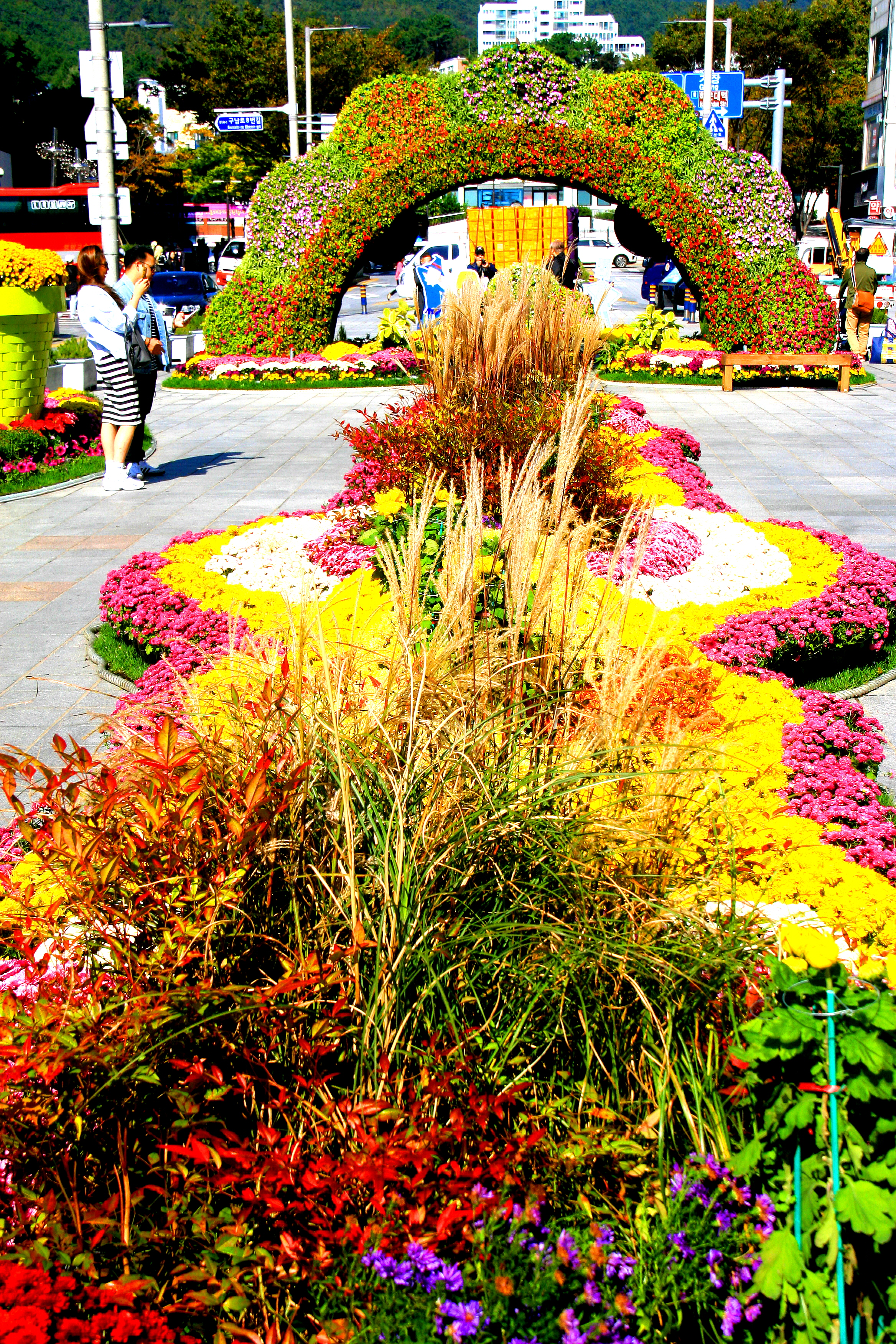 플라워 카트 등 다양한 조형물과 국화를